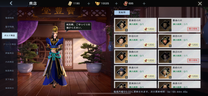商店にあるギルド商店や銅雀商店で武将の片を交換できます。ギルド商店は毎週、銅雀商店は毎日更新されるのでコツコツ交換していきましょう。