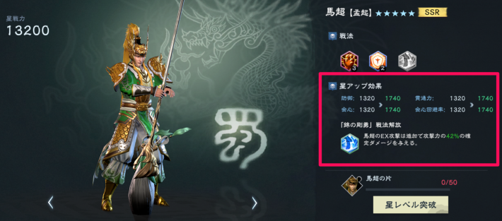 キャラの星レベルを上げることで、キャラのステータスと戦法のレベルを上昇できます。戦法のレベルを上げることで戦法自体の効果が上昇するため、使用頻度が高いキャラは星レベルを優先的に上げましょう。