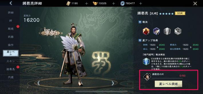 軍師キャラは獲得すると、銀色星5の状態で入手できます。軍師キャラの星レベル突破には、対象の軍師キャラの片が50個必要になります。入手する際はよく考えましょう。