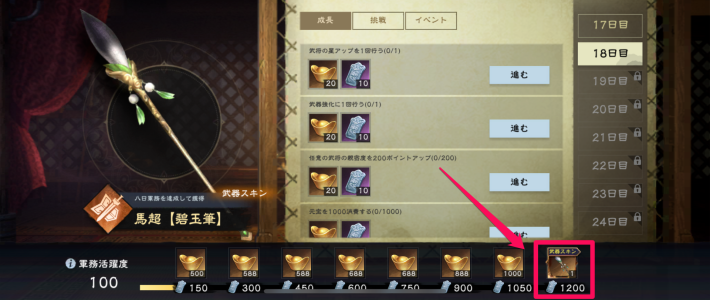 期間限定で挑戦できる8日軍務では、馬超の衣装や武器スキンを入手できます。毎日解放されていくミッションを達成すると「活躍度」を入手可能で、特定の活躍度に達することでスキンを獲得できます。