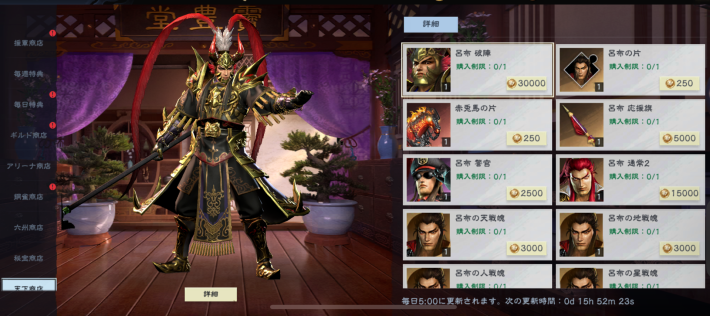 商店にある「天下商店」では呂布の衣装や武器のスキンを交換可能です。天下商店で使用する天下貨は「天下決戦」の報酬として入手できます。