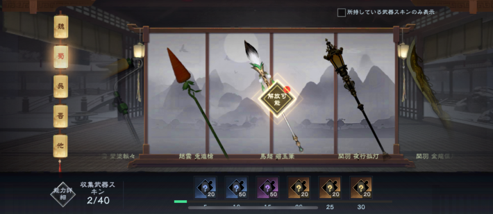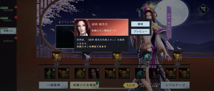 衣装スキンのレベルアップをしたい場合は「素紋絹」や「龍騰紋絹」が必要になります。素紋絹と龍騰紋絹は、商店にある毎週特典やスキン収蔵館の解放報酬として入手できます。
