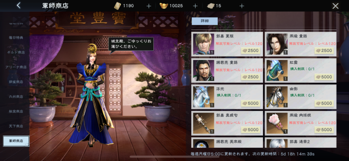 商店にある「軍師商店」では、軍師キャラの衣装や武器スキンを交換できます。軍師商店で使用する詩箋・求賢書は軍師会盟(軍師ガチャ)を回すことで入手できます。