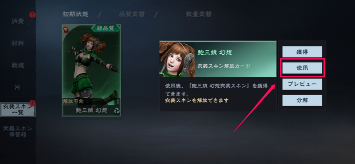 キャラの衣装や武器のスキンは、キャラのステータスを強化できる効果を持っています。キャラのスキンを入手した後に、荷物内の「衣装スキン一覧・武器スキン保管庫」からスキンを使用することで効果を発動できます。