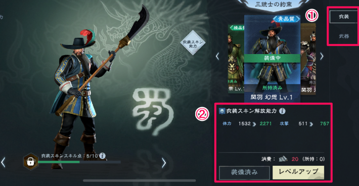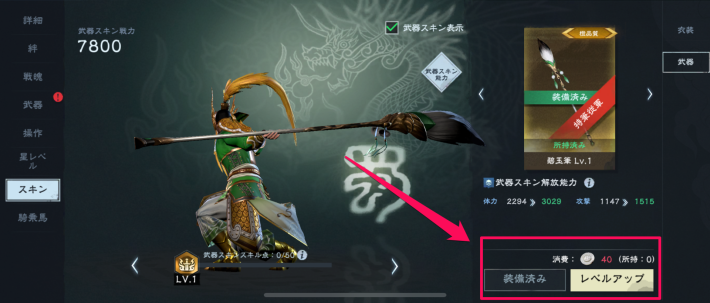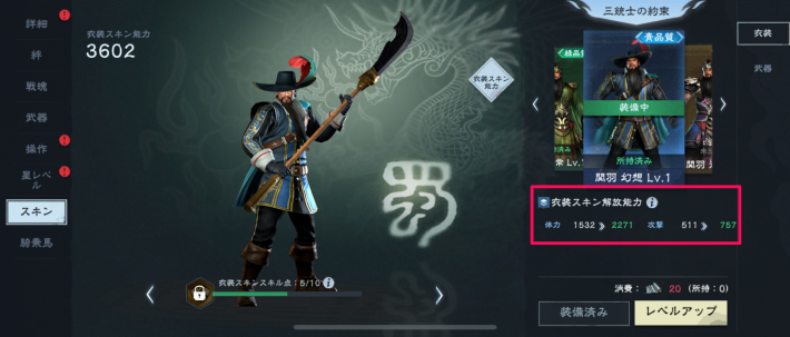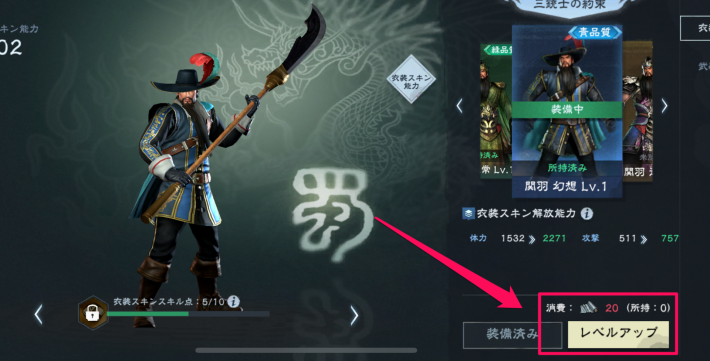 真・三國無双 覇のスキンは、キャラのスキン選択画面からレベルアップができます。スキンのレベルを上昇させることで「スキン解放能力」の効果を上昇可能です。