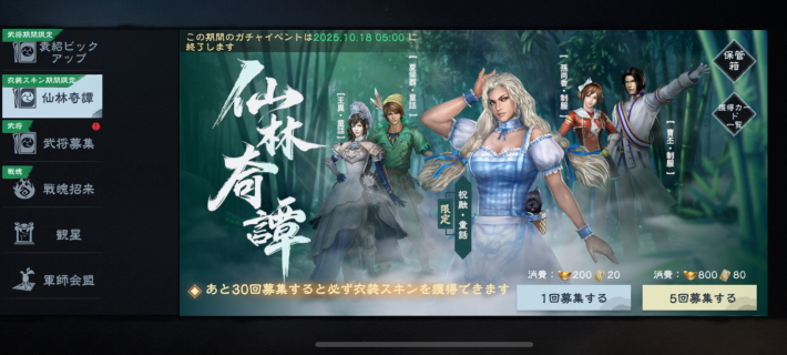 真・三國無双 覇のスキンは期間限定で開催される募集内の「限定衣装スキン」から入手可能です。スキンは元宝と金貨を消費することで引くことが可能で、30回ガチャを引くと必ず衣装スキンを1つ入手できます。