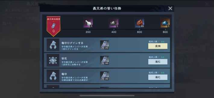 義兄弟の誓い専用の任務が解放され、達成することで報酬を得られます。指定された人数が任務を達成しないと活躍度が貯まらないため、協力して任務をクリアしましょう。