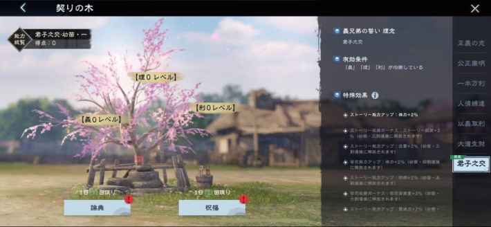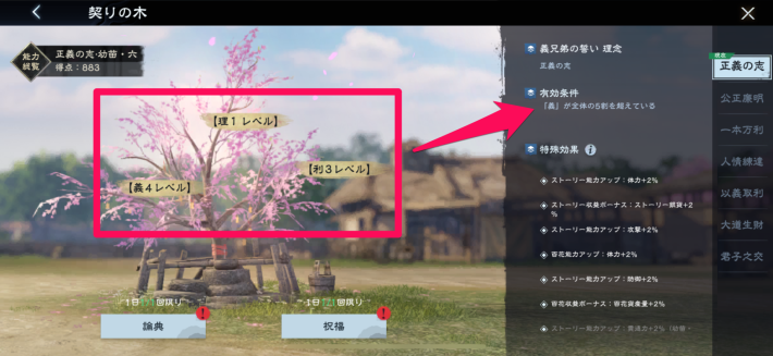 「理/義/利」のレベルのバランスによって義兄弟の誓いの理念が変化し、理念によって特殊効果も変わります。各レベルは論典での選択肢によって上下します。