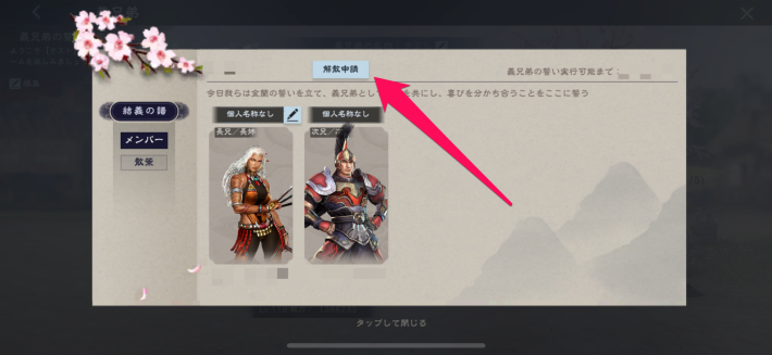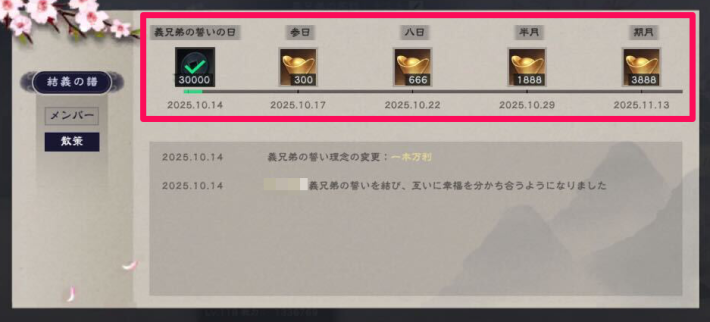 結義の譜では、メンバーの情報や義兄弟の経歴を確認できます。また、義兄弟の誓いでチーム作成後、指定の日数が経つごとに元宝を入手可能です。