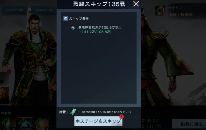 指定の戦闘力を満たしていれば、クリアしていないステージでもスキップ可能です。毎日スキップに必要な券が10枚配られるため、毎日最大10ステージまでスキップできます。