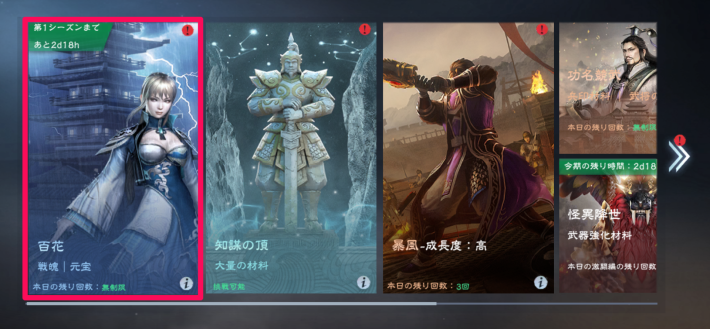真・三國無双 覇の百花は城主レベル15になると解放され、2~3人の武将との戦闘を繰り返し勝利するたびに報酬を獲得できるコンテンツです。シーズン期間が定められており、シーズンが切り替わると再度1戦目からスタートとなります。