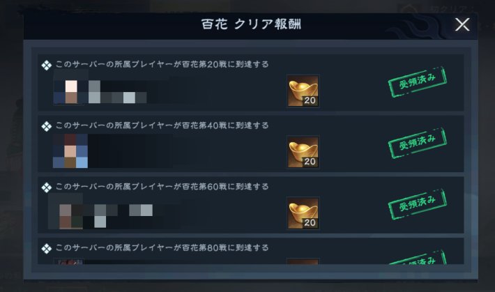 指定のステージまでサーバー内の誰かが到達することで元宝を入手できます。自分が到達している必要はないため、定期的に開いて受け取れる報酬がないか確認しましょう。