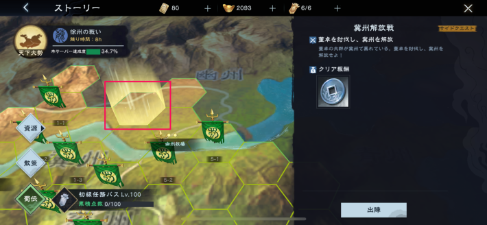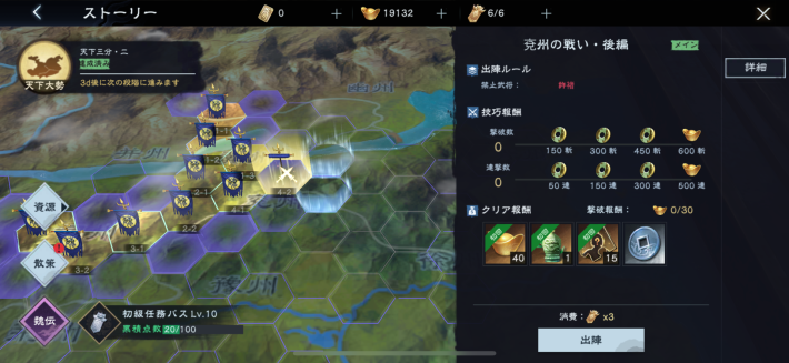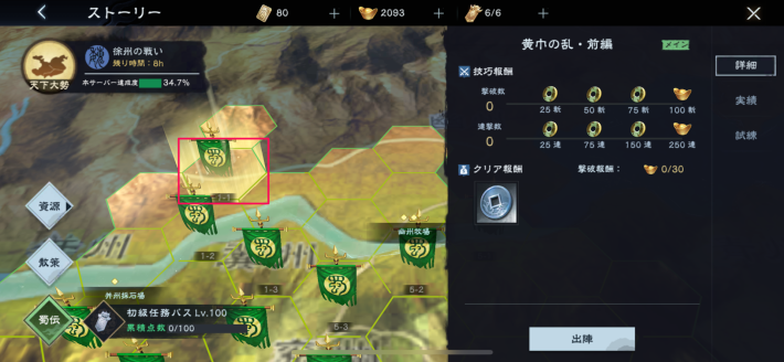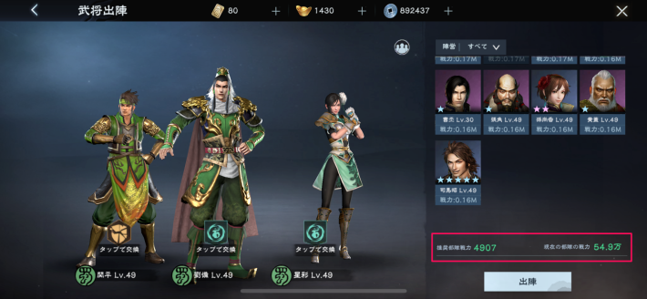 自分の所持している武将を編成しましょう。ステージにはそれぞれ部隊推奨戦力が設定されており、推奨戦力を超えていれば、ステージの戦闘を快適に進められます。準備ができたら出陣をタップすることでステージに挑戦できます。