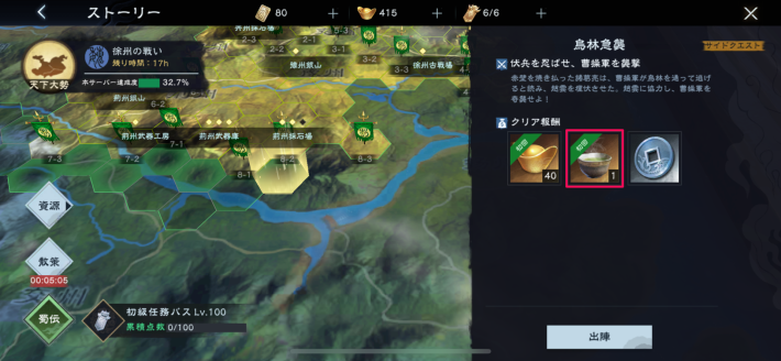 サイドクエストをクリアすることで元宝や銀貨、武将のレベル上限突破素材である酔覚湯などを獲得できます。入手方法が限られているので、サイドクエストもクリアして集めておきましょう。