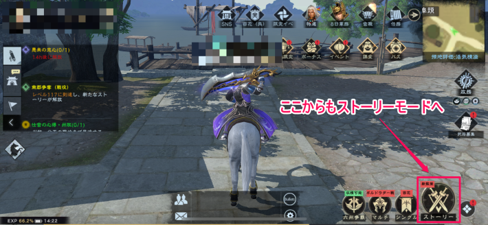 画面下のストーリーボタンからもストーリーの画面に移動することが可能です。こちらはマップ全体を見られるので、以前挑戦したステージに再挑戦したりサイドクエストに挑戦したりする際は、こちら側からストーリーへ進むと良いでしょう。