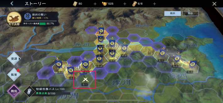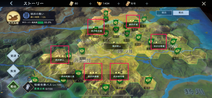 真・三國無双 覇のメインクエストは、マップアイコンに1-1のように数字が表示されているステージです。ステージをクリアすることで次のメインクエストが解放され、挑戦するためには隣接するステージをクリアしている必要があります。