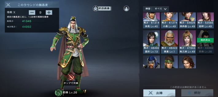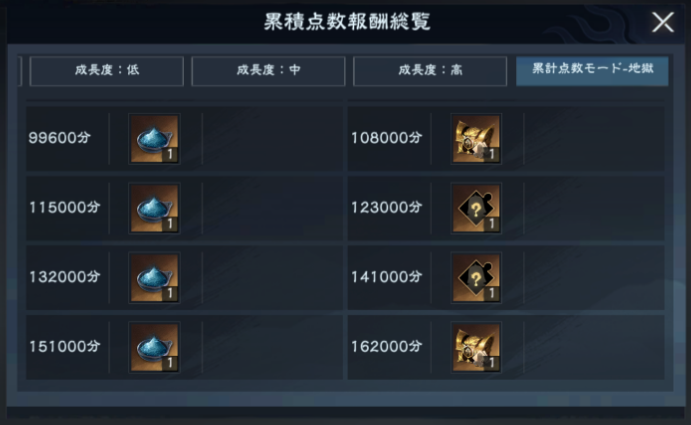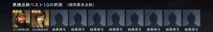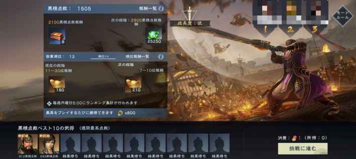 累積点数の報酬は、各武将で記録した最高得点の10人の合計で決定します。より多くの報酬を獲得するには、最低でも10人の武将で挑戦しましょう。