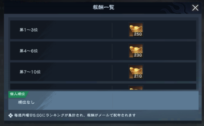 毎週月曜日に週間のランキングに応じて報酬が獲得可能です。上位入賞で元宝がメールで贈られます。