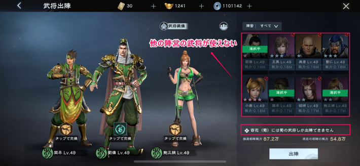 一部のコンテンツでは、指定された陣営の武将で編成しなければならないコンテンツもあります。