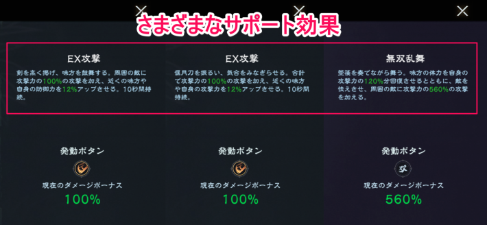 武将の中には、無双乱舞やEX攻撃に味方全体の攻撃力UPやHP回復といったサポート効果を持つ武将もいます。3人編成時は操作キャラを切り替えながら立ち回ることができるので、味方を補助できる武将を編成するとより有利に戦闘を進めることができます。