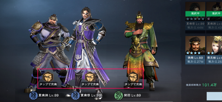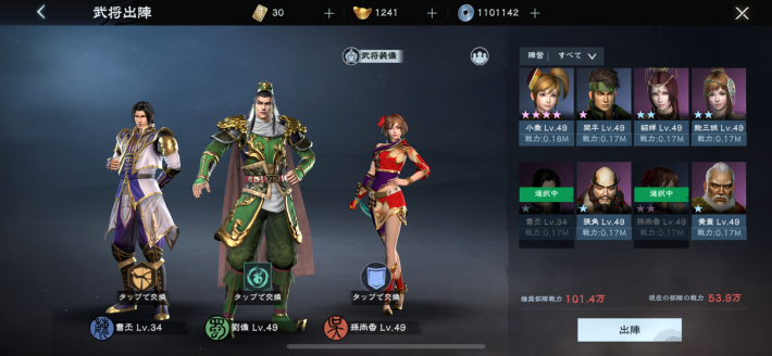各武将は自分の陣営がありますが、同じ陣営の武将で3人編成してもバフなどは特にないので気にせずに編成を組むことができます。