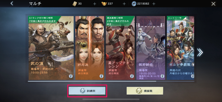 訓練所には、マルチ画面の下部にある「訓練所」をタップすることで移動できます。