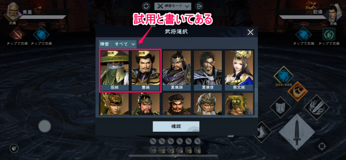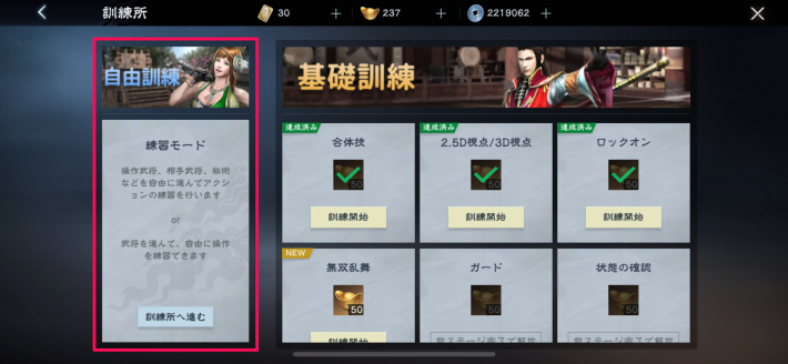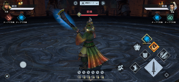 操作武将を所持武将の中から選び、モーションやチャージ攻撃の確認、コンボの練習を行うことができます。新しく武将を獲得した際に自由訓練であらかじめ使用感を確かめておくと、実際にコンテンツでプレイする際に安定した操作をすることができます。