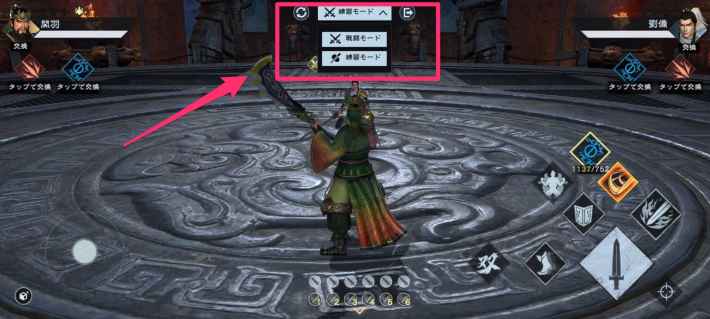画面中央のモードをタップし「戦闘モード」にすることでNPCが戦闘を仕掛けてきます。NPCが動かないようにする場合は「練習モード」をタップしましょう。