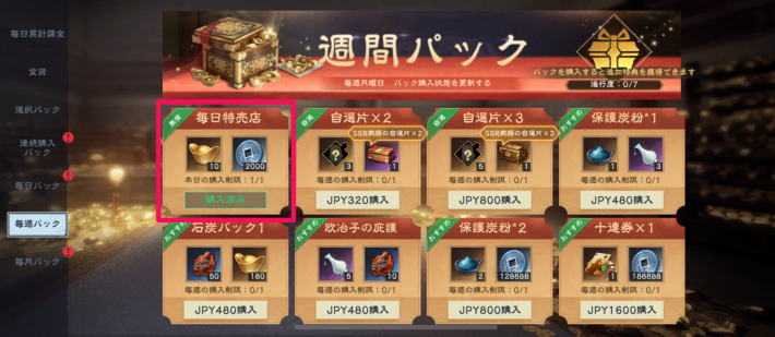 毎週パックは、お得に武将の片や強化アイテムを購入できるパックとなっています。パックの更新がされる前に無償パックを除く全てのパックを購入すると、追加特典としてSSR武将の片<選択>を7個もらえます。