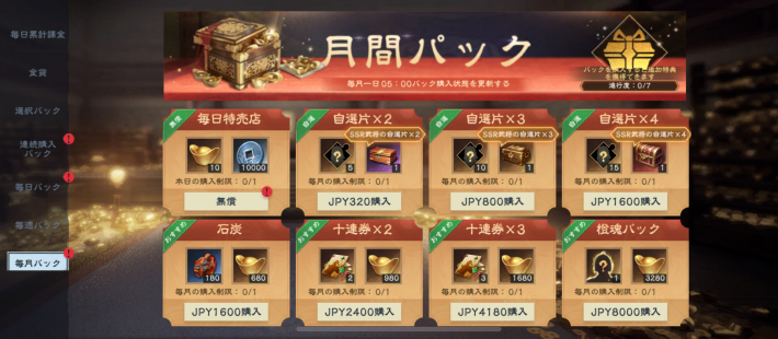 | ¥160特典パック (160円) 1回まで購入可能 | ・元宝×150 ・金貨×60 ・毎日特典パック×1 |