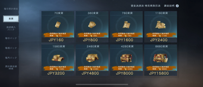 | 8680金貨 (15800円) | ・金貨×8680 ※初回課金時は追加で元宝×8680 |