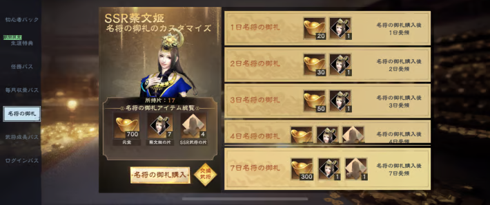 名将の御札は自分の所持している武将の片を選択して購入し、7日間ログインすることで受け取ることができるパックです。所持武将の片しか選択できないので星レベルを上げる際に購入を検討しましょう。