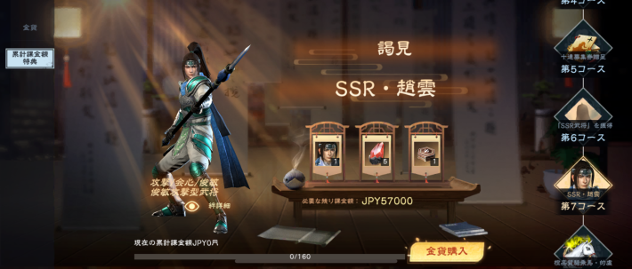 | 第6コース (23000円) | ・SSR武将の片×50 ・盛徳大業×1 ・鴻運満堂×1 |