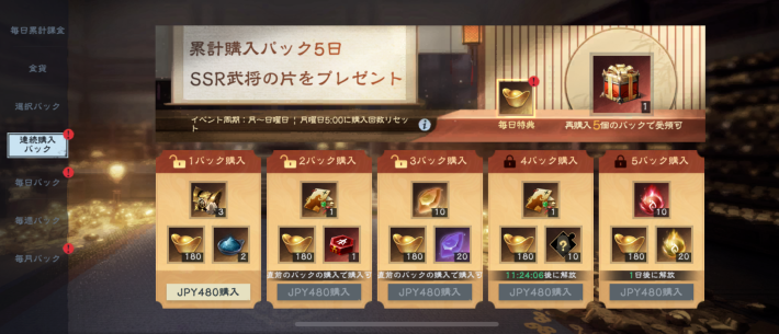 | 4パック (480円) ※3パック購入後+毎週木曜日移行に購入可能 | ・十連募集券×1 ・元宝×180 ・SSR武将の片×10 |