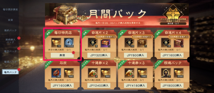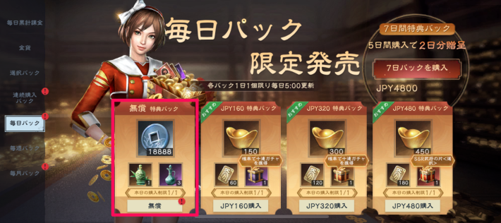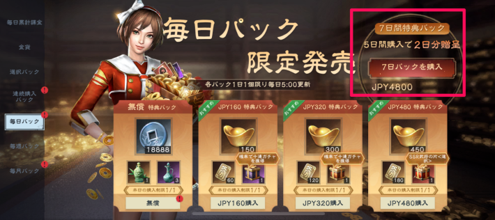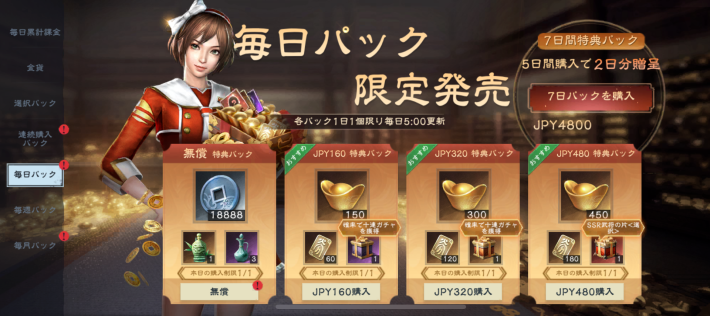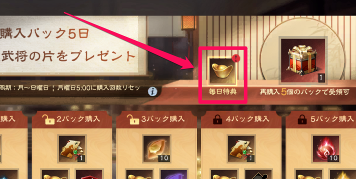 毎日パックでは、毎日お得に元宝や金貨などを入手できるパックを購入可能です。また、同時に入手できる毎日特典はランダムにアイテムを入手でき、十連募集券などを獲得できる場合もあります。
