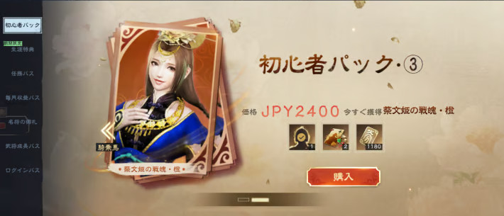 | 初心者パック② (2400円) ※1回のみ購入可能 | ・蔡文姫の戦魄・橙<選択>×1 ※蔡文姫の天戦魄・地戦魄・人戦魄 の内1つを選択 ・十連募集券×2 ・ 金貨×1180 |