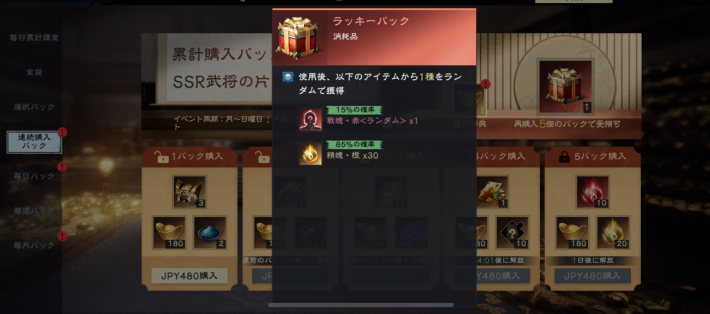 連続購入パックの購入期間中に全てのパックを購入することで、ラッキーパックをもらえます。ラッキーパックでは15%の確率で戦魄・赤<ランダム>×1を獲得可能で、残りの85%では精魄・橙×30個を獲得できます。