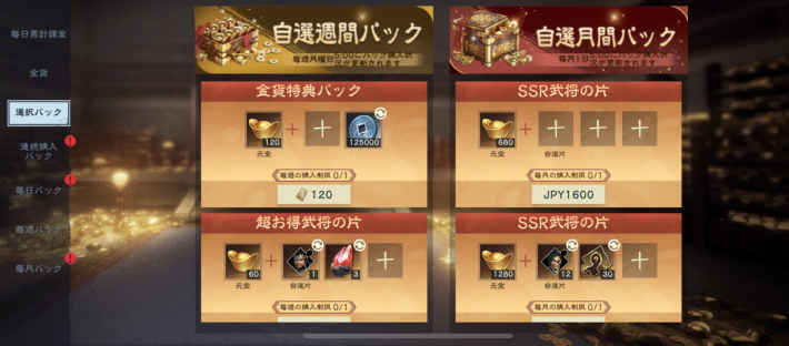 ショップにある選択パックは、元宝の他にアイテムを選択して購入できるパックとなっています。パックごとに選択できるアイテムが異なり、武将の片や強化素材などを選択可能です。パックは毎週・月間パックに分かれていて、それぞれ期間内に1度だけ購入できます。