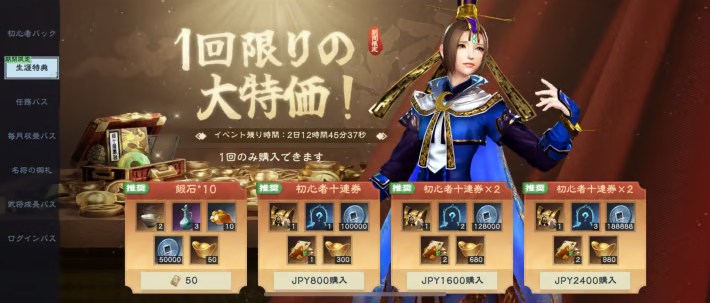 | 初心者十連券 (800円) ※1回のみ購入可能 | ・SSR武将の片<選択>×1 ・戦魄・青<ランダム>×1 ・銀貨×100000 ・十連募集券×1 ・元宝×300 |