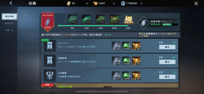 まずは城主レベルを12まで上げて、「毎日任務」の解放を目指しましょう。城主経験値を毎日大量に獲得できるため、コンテンツ解放に大きく役立ちます。その後は、城主レベル51の元宝や十連募集券を毎週獲得できる「毎週任務」の解放を目指していきましょう。