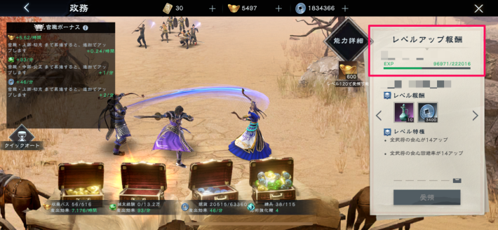 政務はオフライン時も含め放置しているだけで城主経験値が貯まっていきます。丸1日放置すると少しあふれてしまうので、こまめに受け取るようにしましょう。
