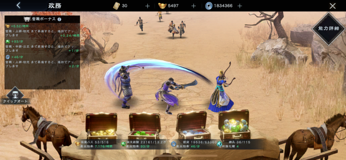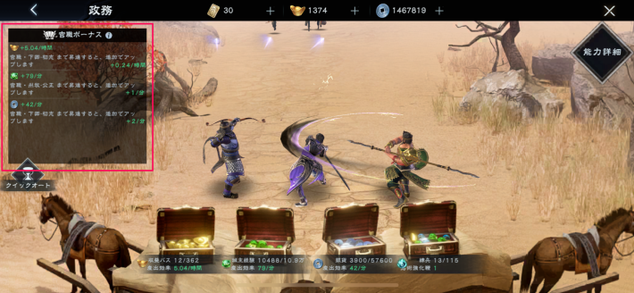政務の城主経験値は、官職の昇進ボーナスの影響を受けるため、合わせて官職も昇進させておくとさらに効率よく城主経験値を稼げます。