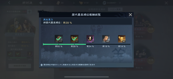 絆対決は、自分の武将と他プレイヤーの絆を競うコンテンツです。勝つたびに順位が上がり、一定以上の順位に入ると元宝を獲得できます。解放している絆の数に応じて獲得できる元宝の総数も増えていきます。他にも商店で武将の片と交換できる銅雀幣もたくさん獲得できるので毎日忘れずにプレイしましょう。