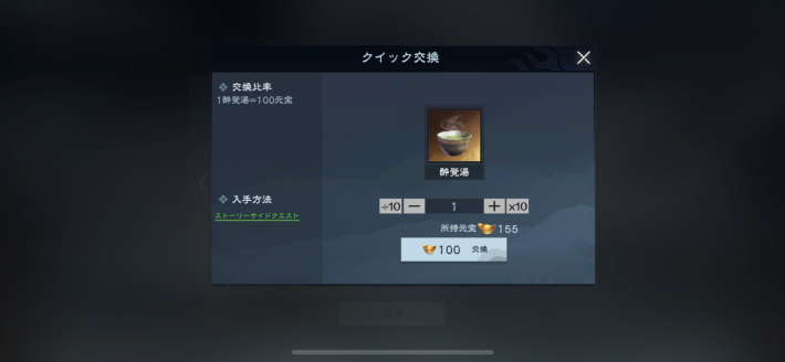 元宝100個で武将突破材料の酔覚湯と交換できます。酔覚湯は入手できる場所が限られているので、足りない場合は元宝で交換しましょう。