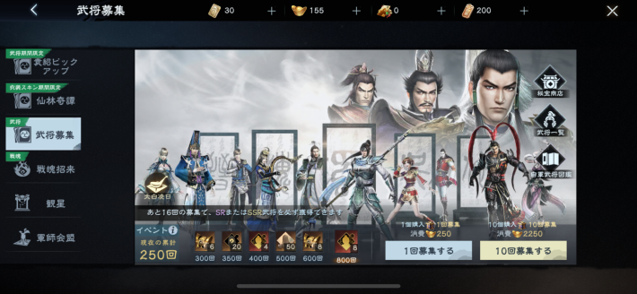 元宝の主な使い道は、ガチャ(武将募集)を回すために使用します。限定募集を回すには金貨も必要になるため、基本的には恒常ガチャの武将募集に使います。
