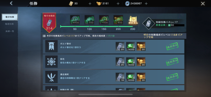 毎日任務、毎週任務を達成すると大量の元宝を獲得できます。他のコンテンツと比べてもっとも効率が良いので忘れずにこなすようにしましょう。