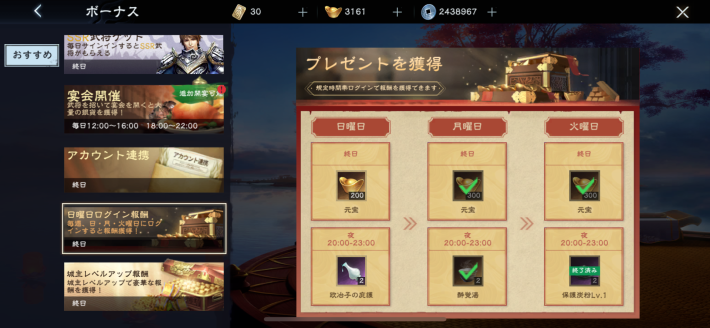 曜日ログイン報酬では月・火・日曜日にログインすることで元宝を獲得できます。特に達成する条件はなくログインするだけでもらえるので忘れず回収しておきましょう。