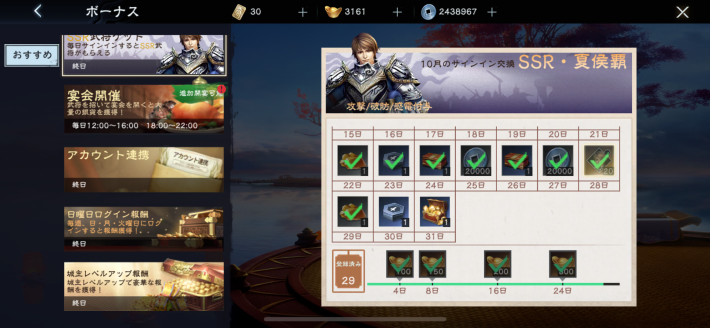 サインイン報酬では毎月一定の日数ログインすることで、元宝を獲得できます。元宝の他にも育成素材や特定のSSR武将の片を累計50個(キャラ解放できる数)獲得できるので、忘れず毎日ログインするようにしましょう。