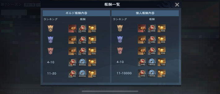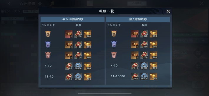 六州争覇は個人順位とギルドの順位を競ってランキング報酬を獲得できます。ギルドの順位はギルドメンバーが獲得したポイントの合計に応じて決定されます。また、シーズン中で上位2つのギルドは「天下決戦」の参加資格がもらえます。
