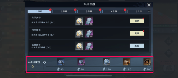 | レベル3の領地を1回進攻する | ・威望貨×10 ・六州活躍度×10 |